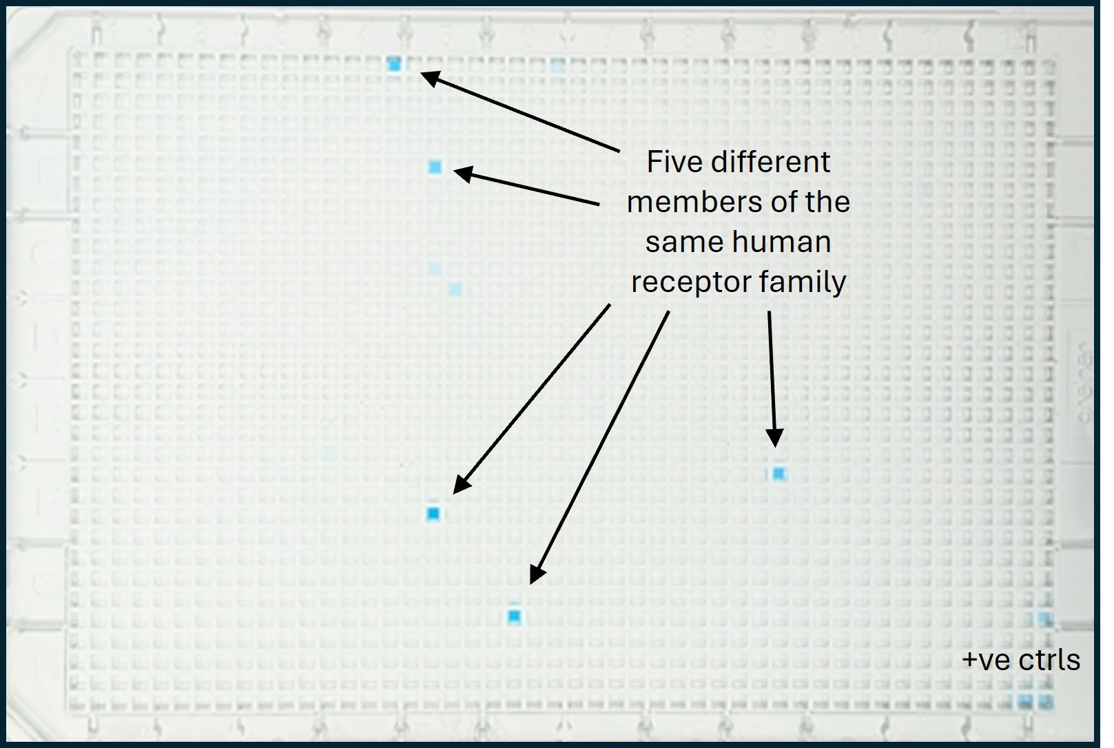 The Ectocellect human receptor array was used to identify direct interactions with human host receptors for a parasite immunoregulatory ligand. Specificity is demonstrated here as the ligand identified five different members of the same human receptor family.